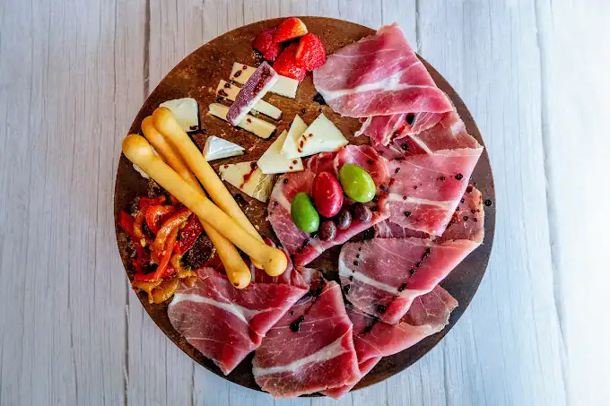 Premium cured ham with truffle flakes on a wooden plate, gourmet Italian delicacy.